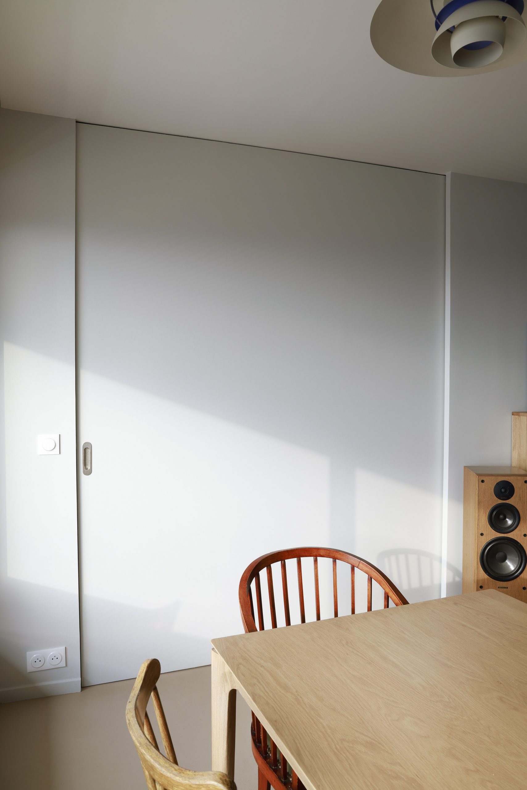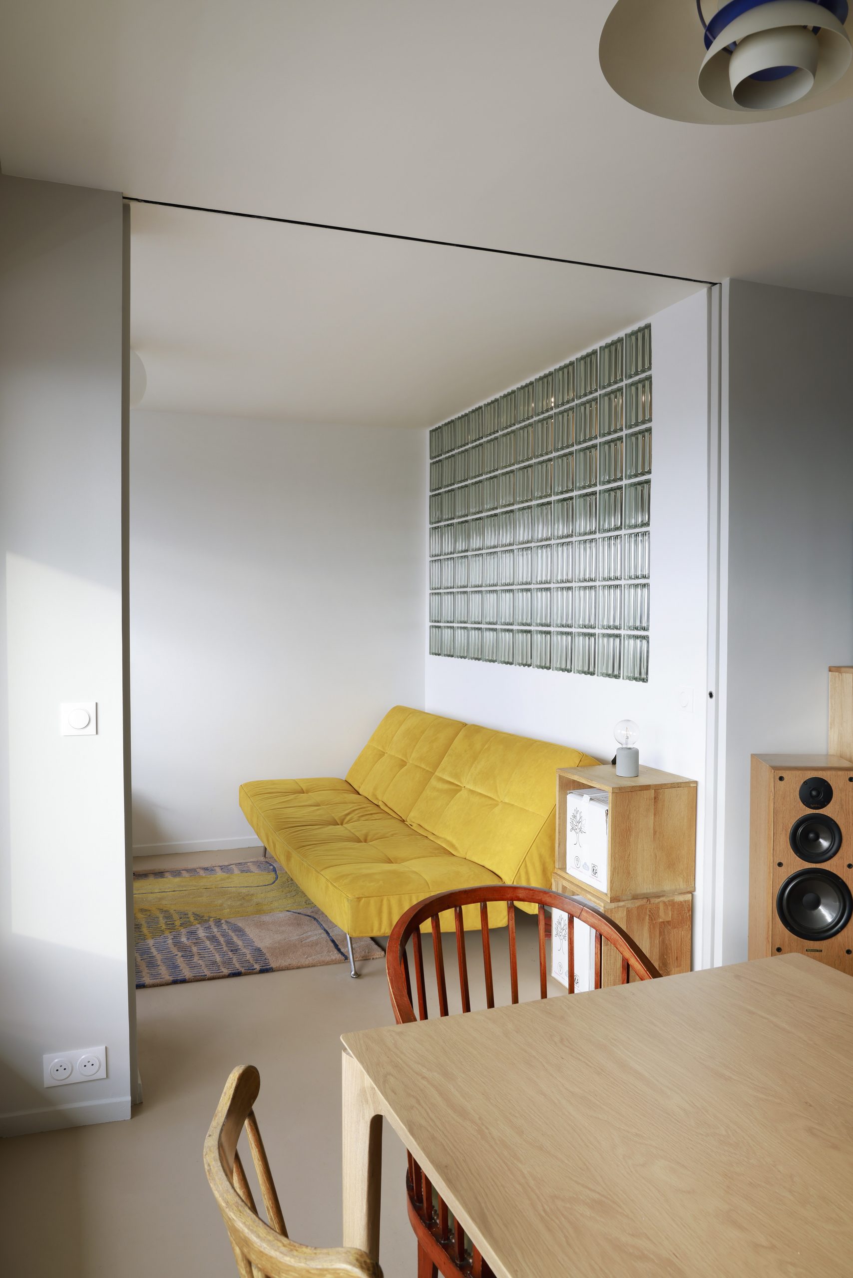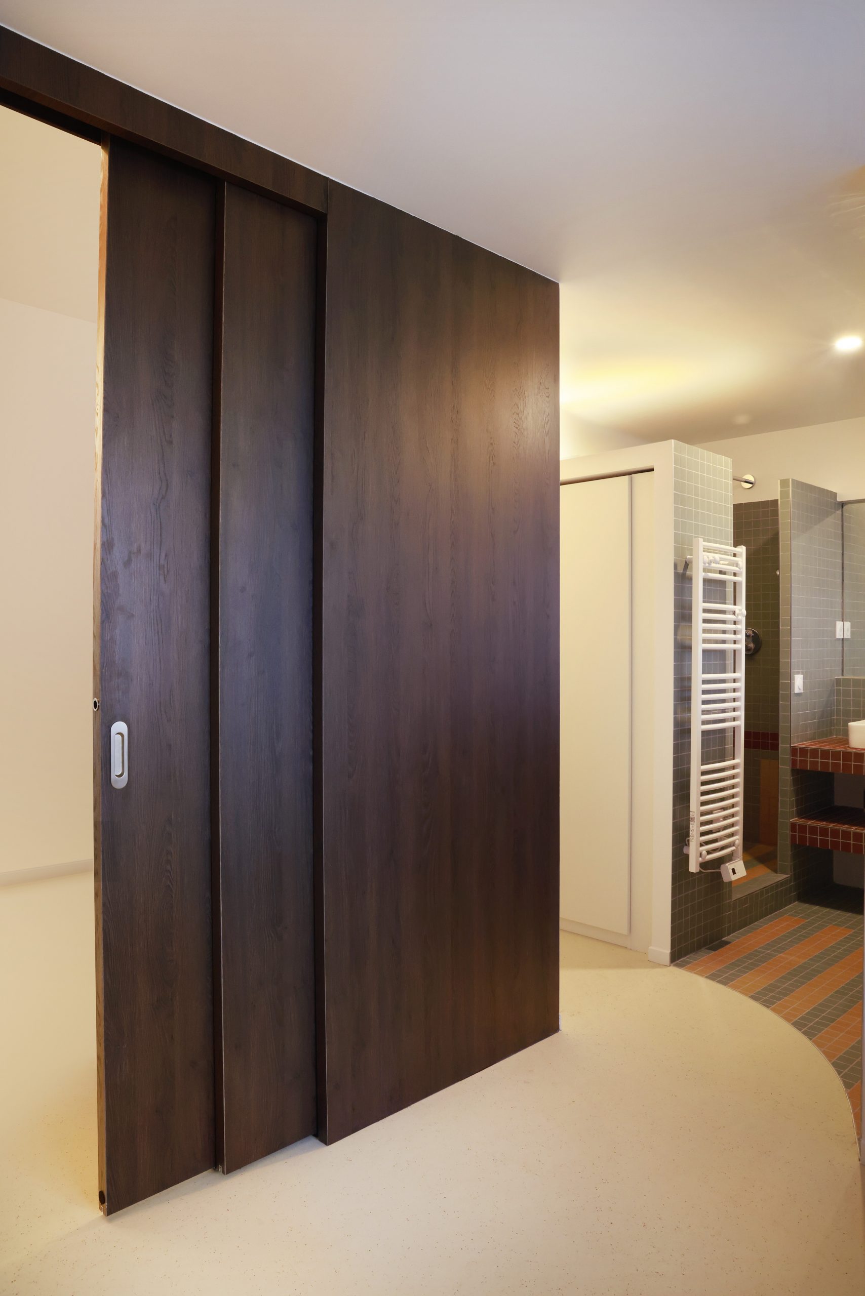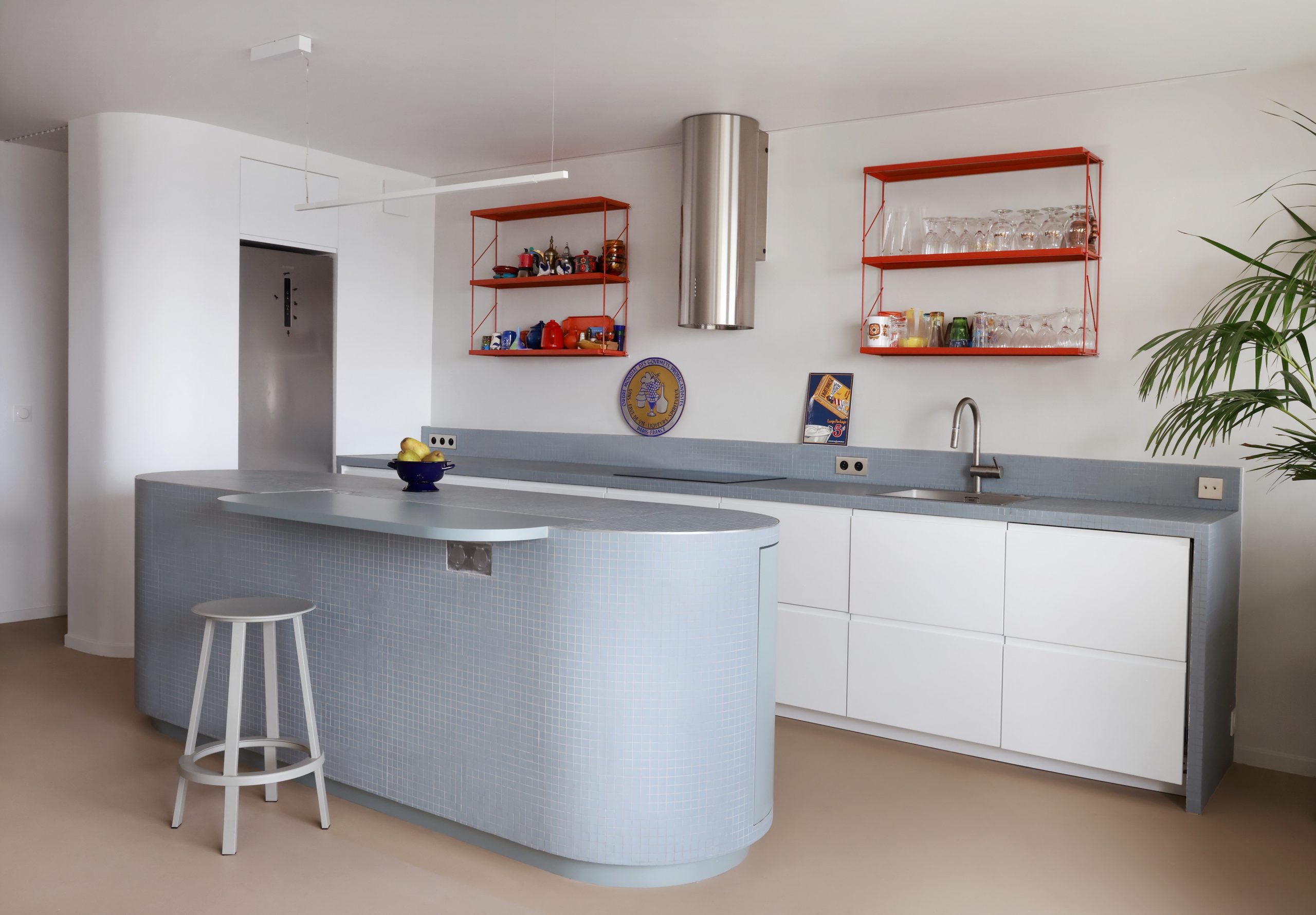 Situé au 23ième étage d’une tour avec vue imprenable sur Paris, cet appartement n’avait fait l’objet d’aucune rénovation depuis 30 ans. Ce fut l’occasion pour l’agence de repenser totalement sa distribution, de décloisonner pour offrir à la cuisine un espace de réception et de contemplation sur Paris. Pensées de manière modulable, deux cloisons rétractables permettent de séparer ou d’ouvrir les espaces. Lieu d’expression des matériaux, des formes et des couleurs, les différents choix esthétiques réinterprètent les années 70 avec une sobriété contemporaine.