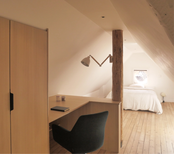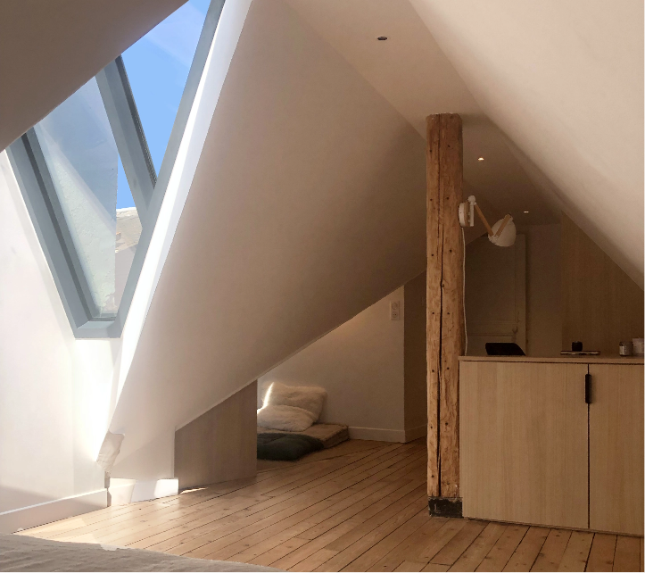 Au cœur de la ville de Maisons-Alfort, le projet de cette famille consistait à la rénovation de combles avec surélévation. La maison est classée par les ABF au monument et patrimoine historique, les possibilités de rénovation et de surélévation étaient de fait très limitées. Le projet s’articule autour d’une verrière qui fait la liaison entre la chambre et la salle de bain. Des isolants minces et très performants ont permis de réduire le complexe d’isolation en toiture afin d’optimiser la hauteur sous plafond. Notre intervention a permis au client de retrouver l’usage de 40m2 de combles inexploités pour y installer la nouvelle suite parentale.